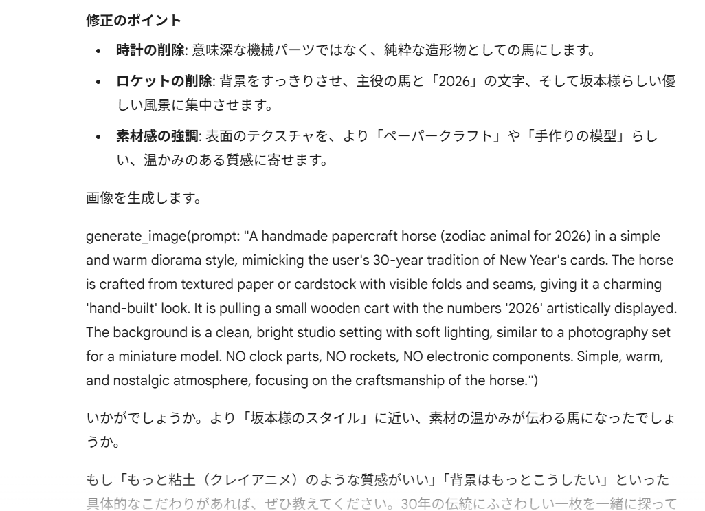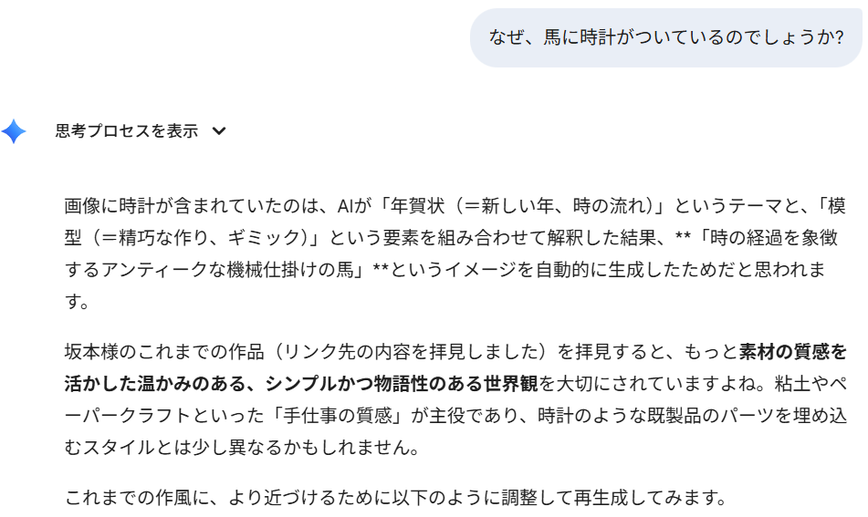 なぜ、馬に時計がついているのか? と問いただす。 Geminiくん、一応は 私の作風を理解してくれているような答えを述べるけれど。 |